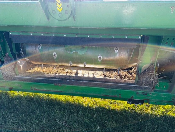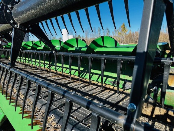45'/ Flex Draper/ Finger reel with flip over bundle/ Header height sensors in rigid mode/ Poly/ 70%/ X-Series/ Top Auger/ side cutters were added to this head in 2025 for canola crop both sides