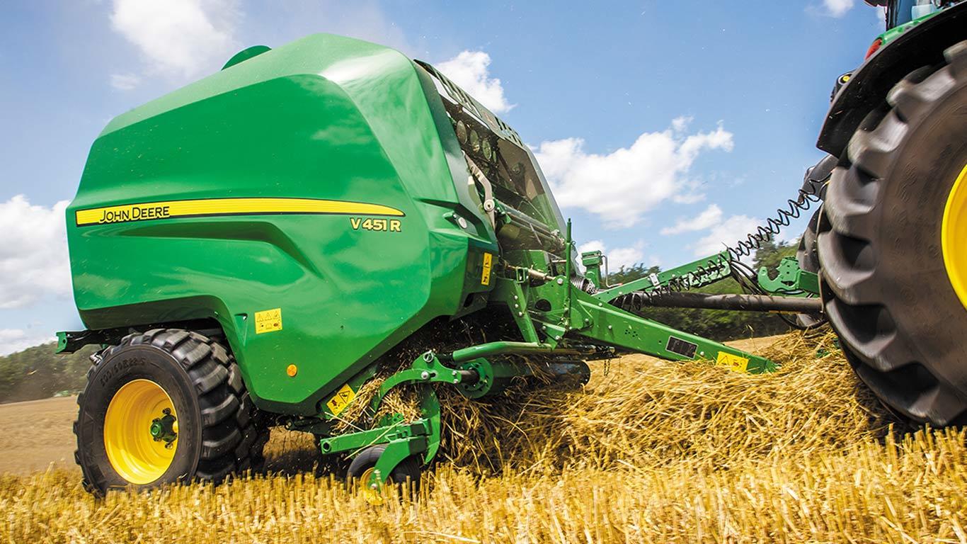 The V451R can produce bales up to 1.60-m (5.2-ft) diameter with a 1.21-m (4-ft) bale chamber width. The MaxD – maximum density – bale chamber has been designed to deliver very heavy, dense, and perfectly shaped bales, officially proven by DLG.